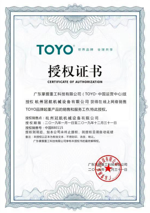 杭州冠航機(jī)械設(shè)備有限公司為T(mén)OYO中國(guó)運(yùn)營(yíng)中心授權(quán)的線上網(wǎng)絡(luò)銷(xiāo)售商。